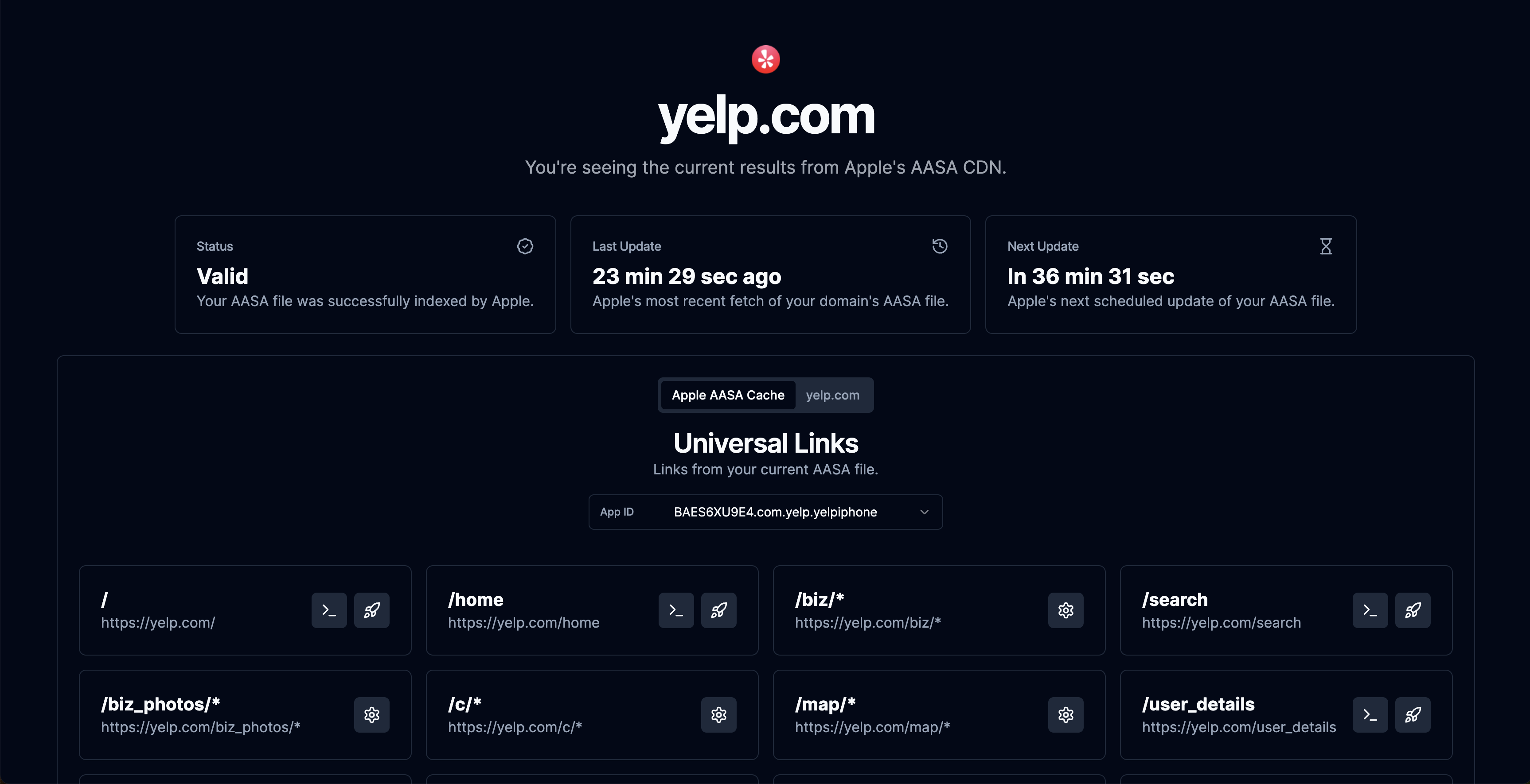 For example, https://getuniversal.link/yelp.com gives you dashboard for testing all of Facebook's universal links.