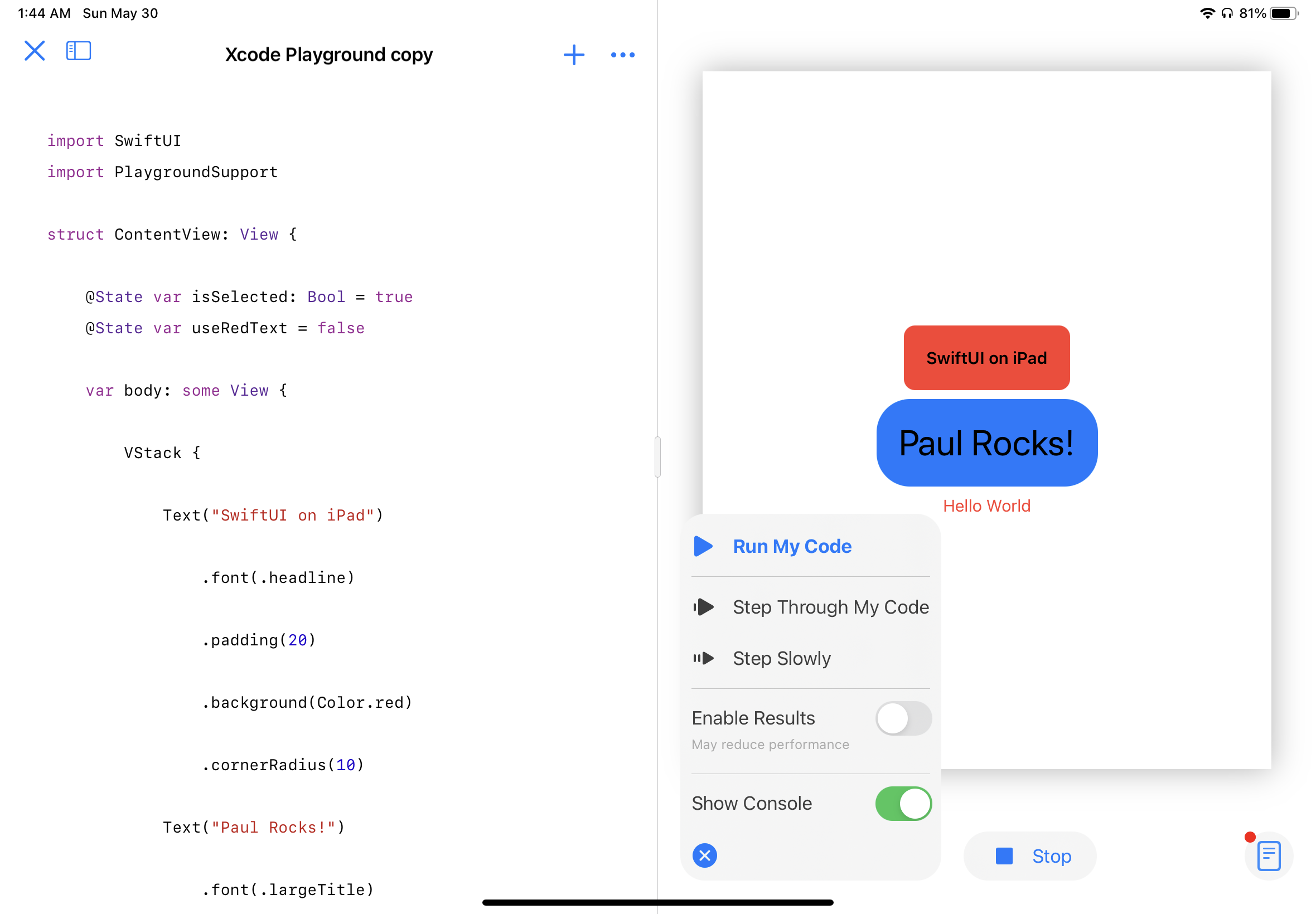 iPad Pro running iOS 14.4, Playgrounds App version 3.4