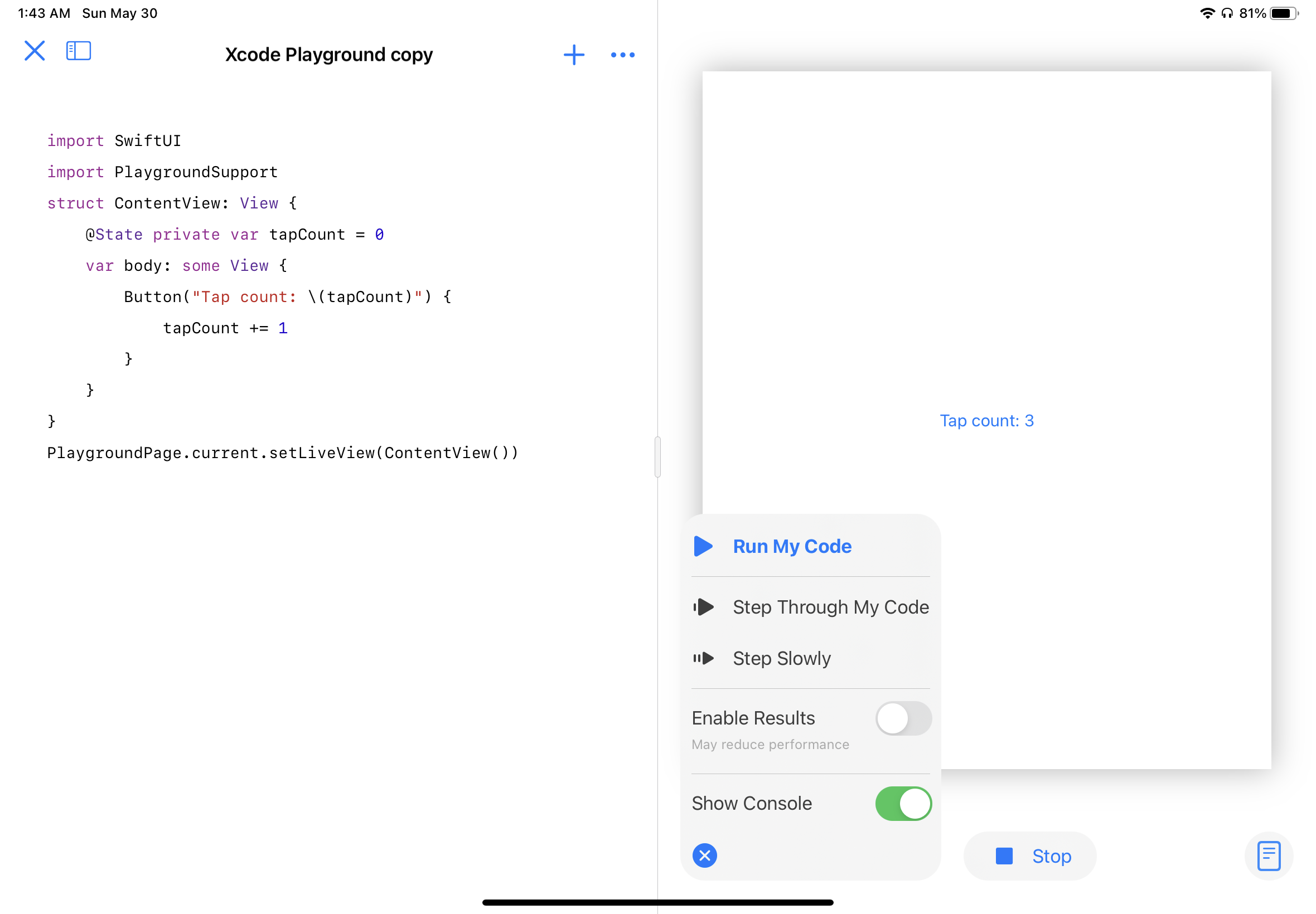 Code Block Swift import SwiftUI import PlaygroundSupport struct ContentView: View { @State private var tapCount = 0 var body: some View { Button("Tap count: \(tapCount)") { tapCount += 1 } } } PlaygroundPage.current.setLiveView(ContentView())