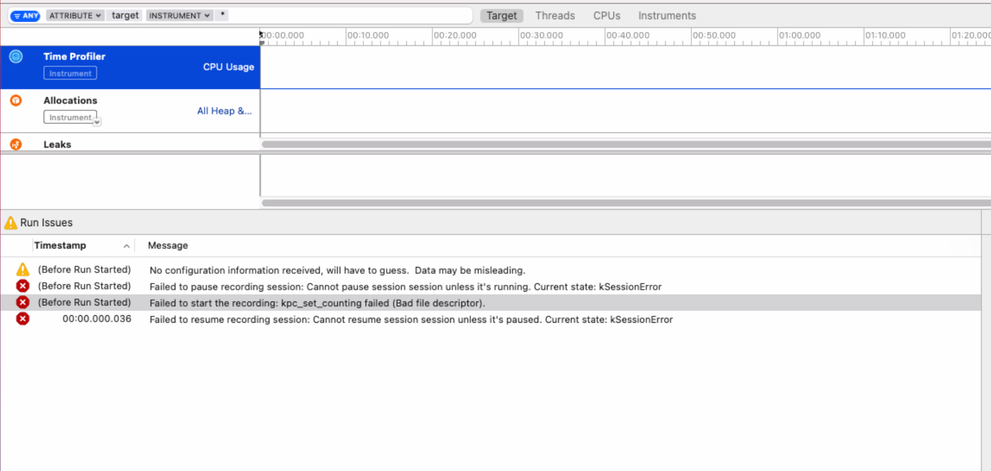 I want to know what kind of configuration is missing and how to configure it.I have also observed that Allocations, Leaks, VM Tracker has no issues.