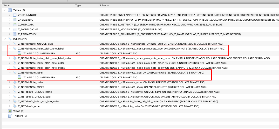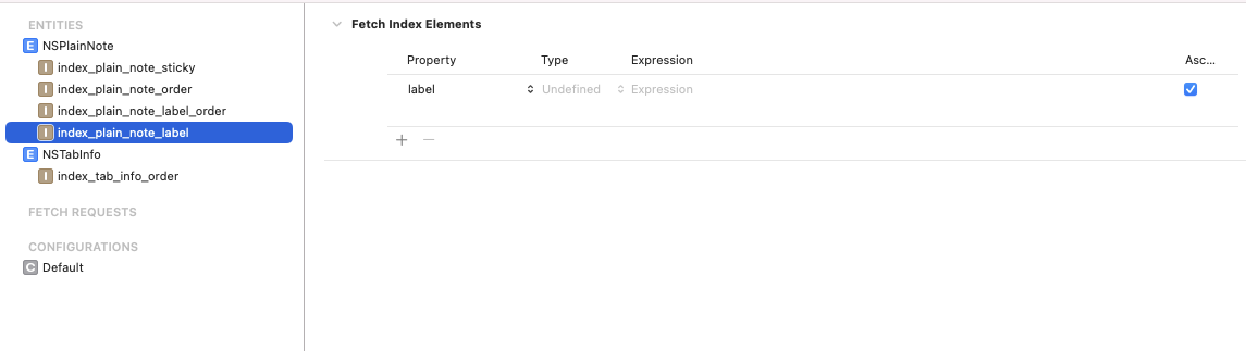 For instance, for entity named NSPlainNote, I try to create an index named index_plain_note_label, on property label.
