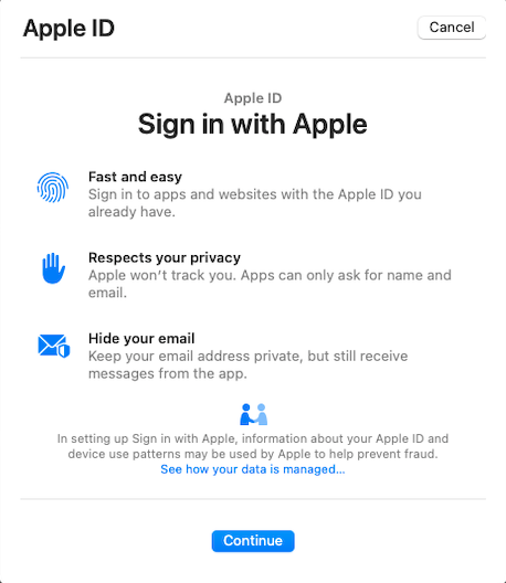 In my M1 Mac testing, when pressing the ASAuthorizationAppleIDButton, it shows a nice popover explaining Sign in with Apple, but then when pressing "Continue" it just turns into a white screen with no options to continue or exit out so that the app is effectively frozen.