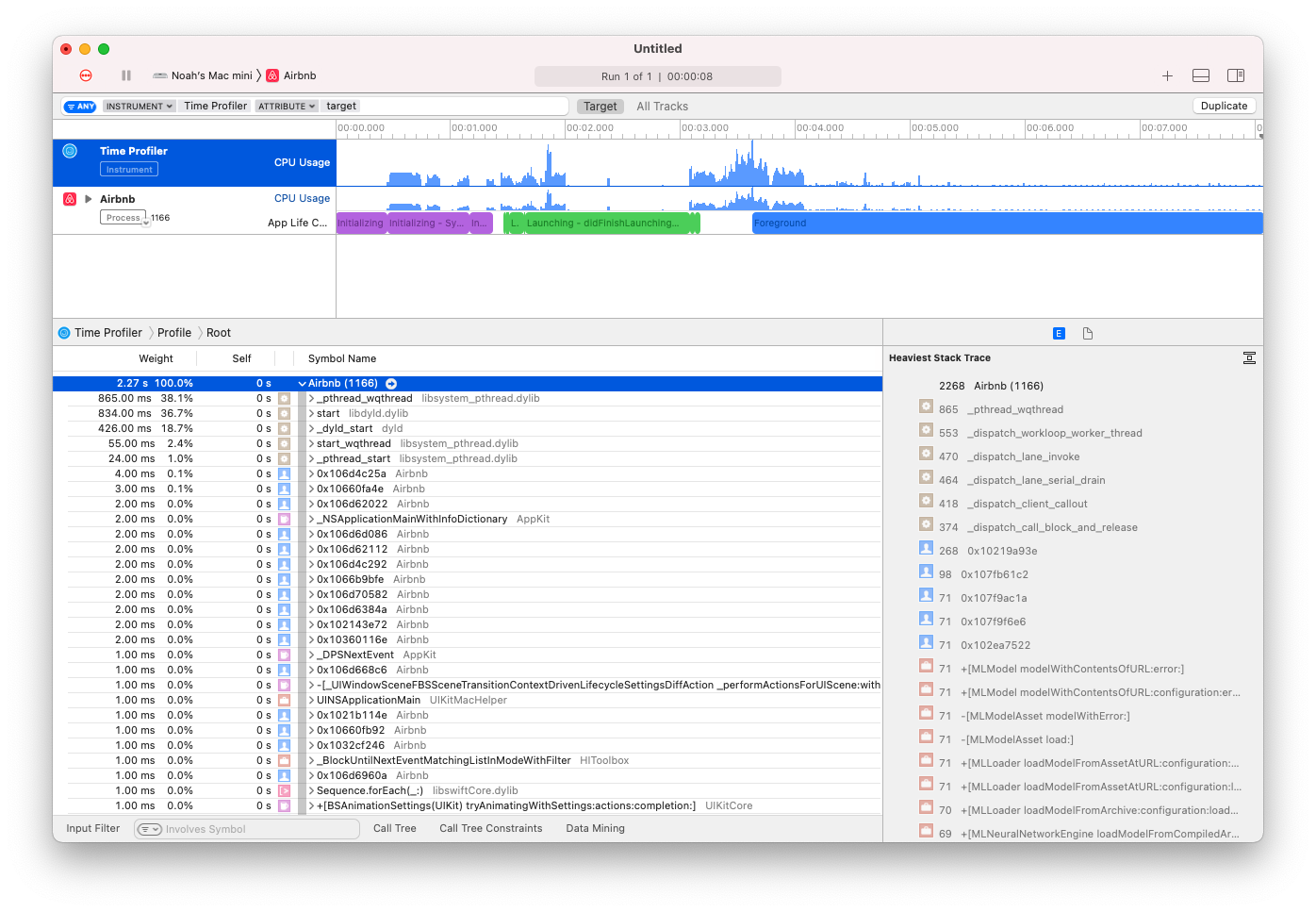 I also tried launching the internal iOS .app using: xcrun xctrace record --template 'App Launch' --device CE3D229D-A2BF-5455-8923-5D49498F06DC --launch -- '/Applications/Airbnb.app/Wrapper/Airbnb.app' but got the same crash.