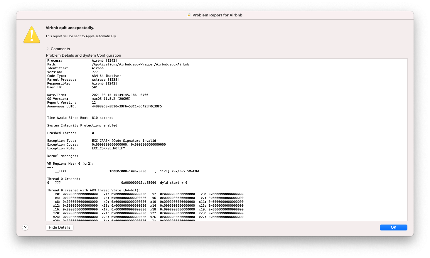 Using the id of my Mac returned from xcrun xctrace list devices. This attempts to launch the app but it immediately crashes with an error about an invalid code signature: