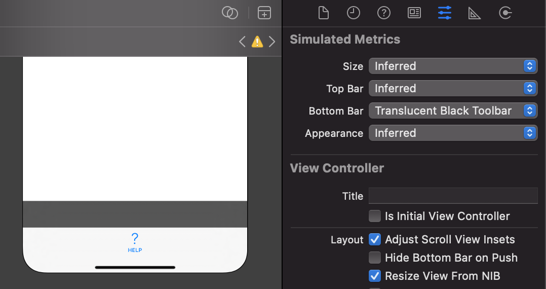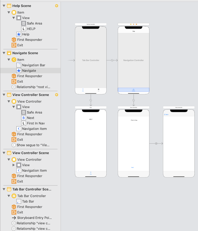 I m not dead set (or even happy) with this layout but am, trying to learn as I go and got stuck trying to understand (among other things) is what appears to be a space or place holder above the navigation tabs on the two lower left storyboards. I do not have a toolbar or other view there.