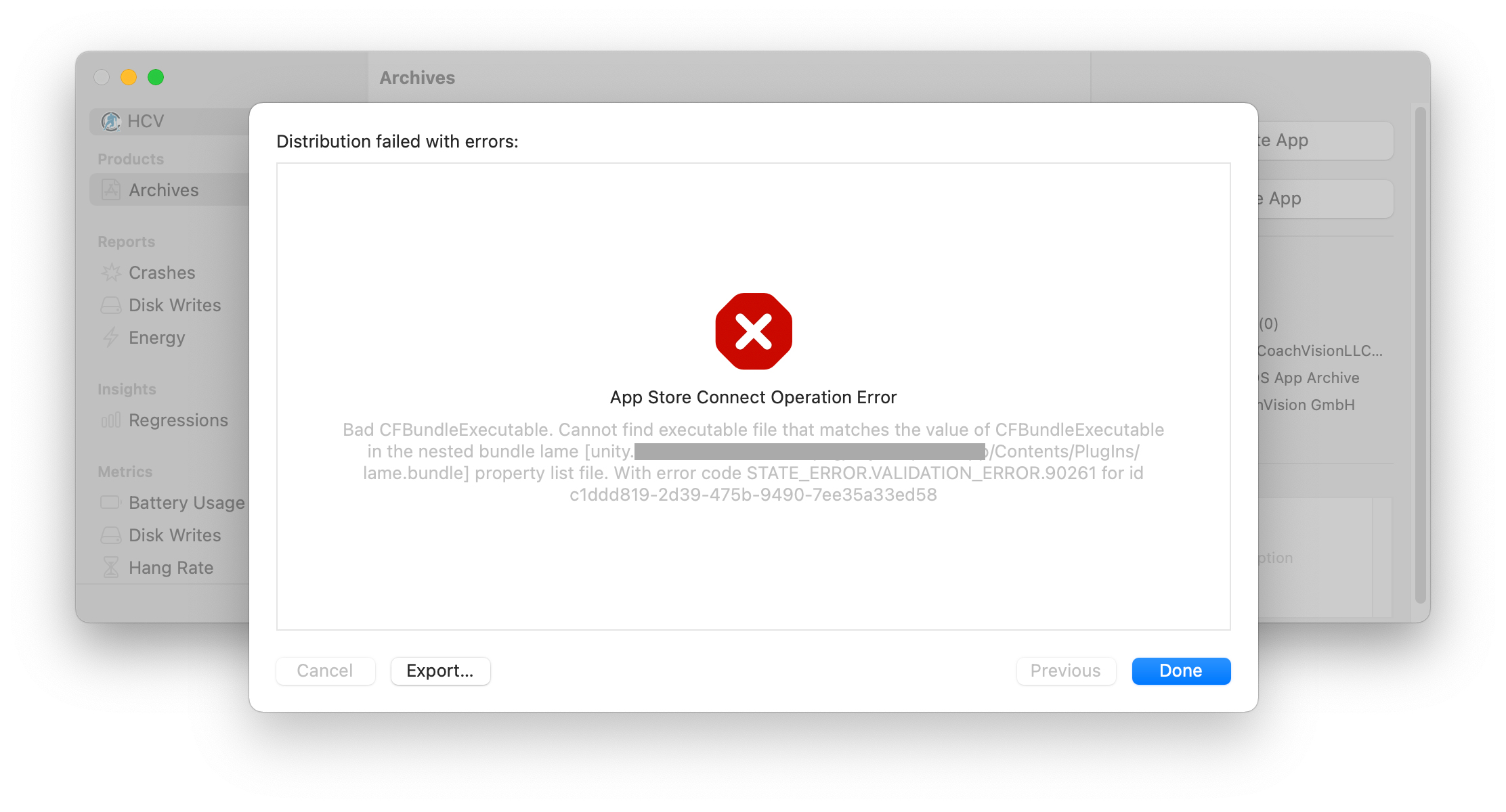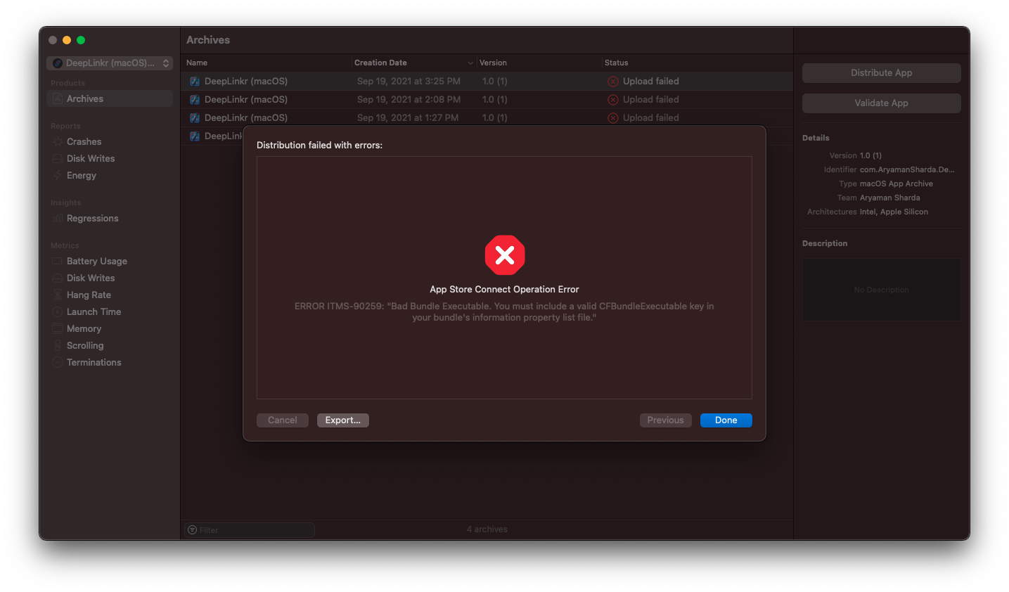 However, I was able to replicate the issue with an entirely empty project. No dependencies, no code, nothing. The project archives successfully, but the upload fails.