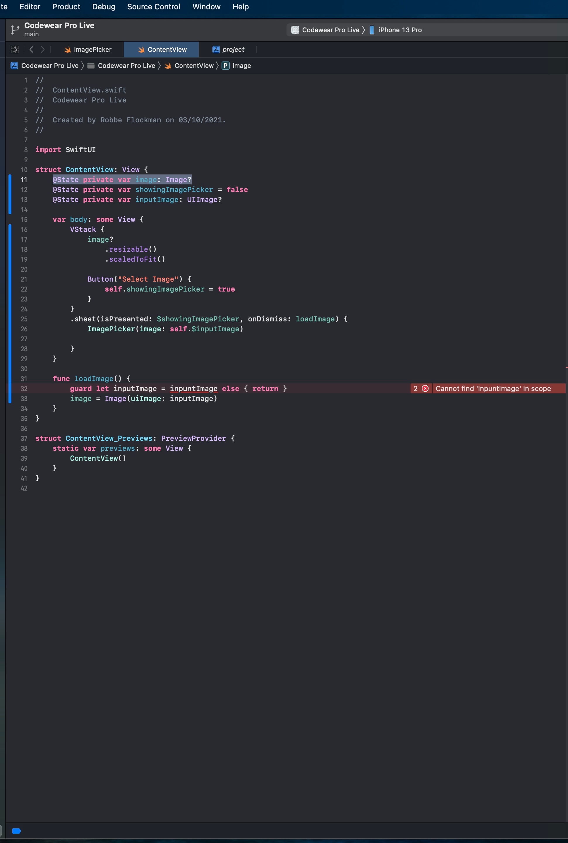 I’m currently making an broadcast app for iPhone / iPad and mac, for this app I need an UIImagePickerController. But in my code get the following error: Cannot find ‘inputImage’ in scope.