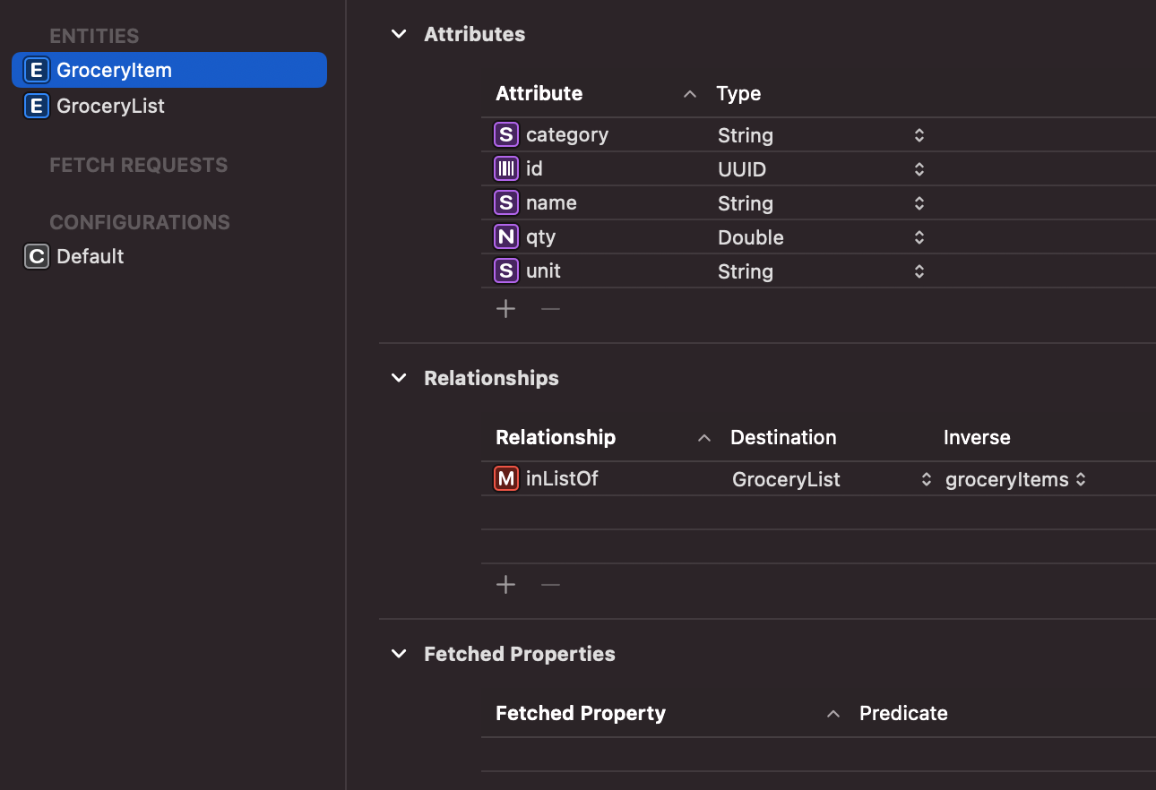 I have an ShoppingItem Entity(attributes: name, id, unit, qty, description) and another entity ShoppingList(attributes: listDate, listName) and a relationship property : items which is many-to-many relationship.