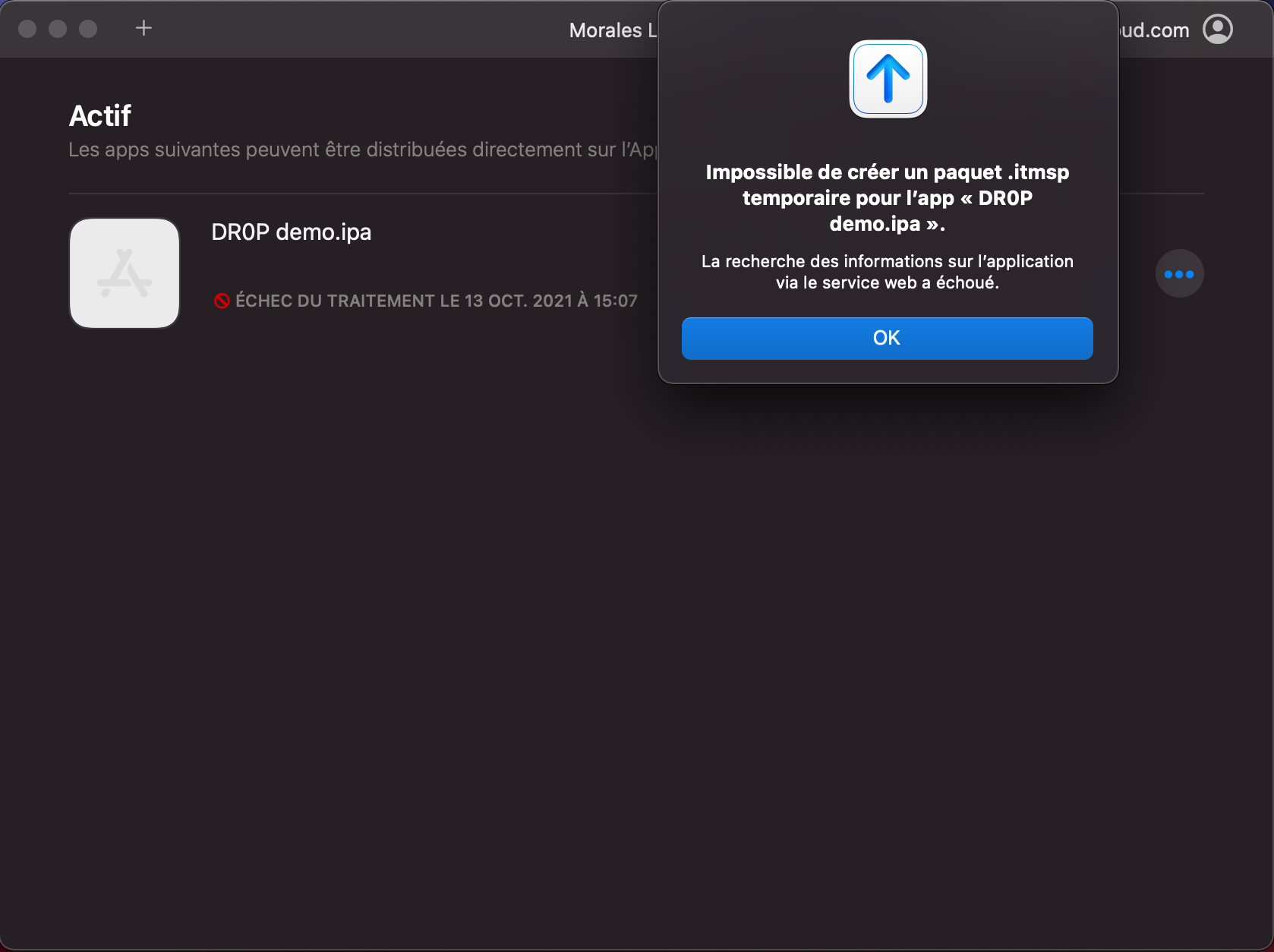 I try to to use Transporter for the second time and it doesn't work. Their a message who say : "Unable to create a temporary .itmsp package for the app "game.ipa". The search for information about the application via the web service has failed. "