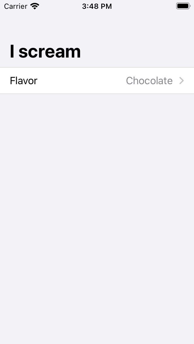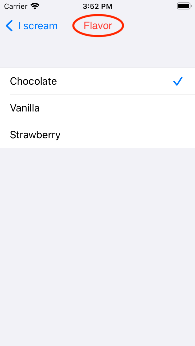 I would expect a title over the selection of "Flavor" when the Picker is opened in a new view (marked in red), but there is no title and I did not find out how to add one without altering the title of the parent view:
