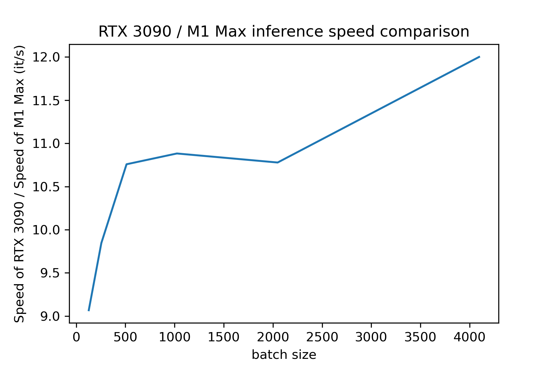 Here is the detailed performance comparsion of a RTX 3090 / M1 max for different batch size used which shows RTX 3090 is roughly 10 times faster than a M1 max and even faster for bigger batch size: