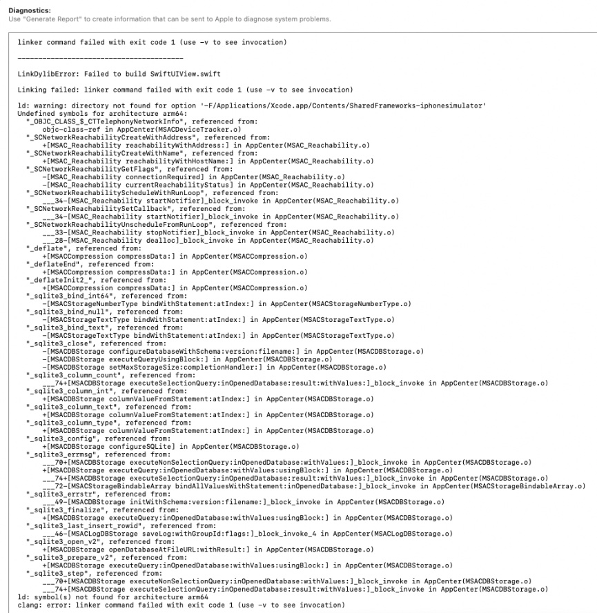 When preparing the project file, we ran into a linker error when using SwiftUI previews. The error was caused in the AppCenter framework and only occurs on iOS. macOS had no issue starting the preview, even though it uses the same framework.