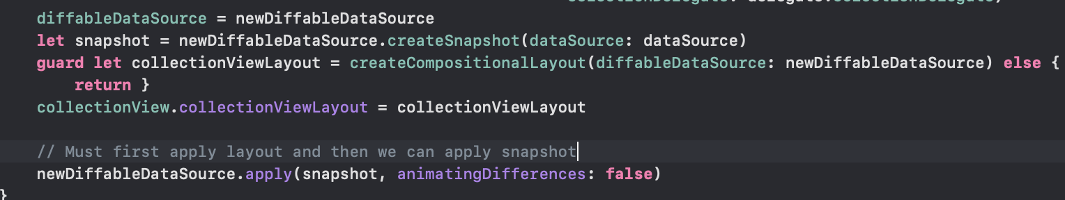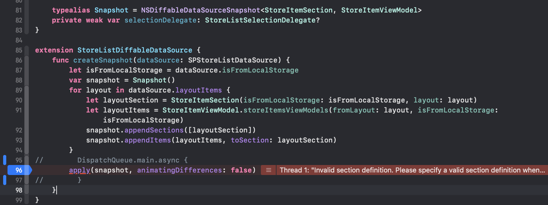 This error also never happens the first time we apply the snapshot. Inspecting the snapshot.sectionIdentifiers and the data shows the expected definitions. So we are kind of stumped on this one.
