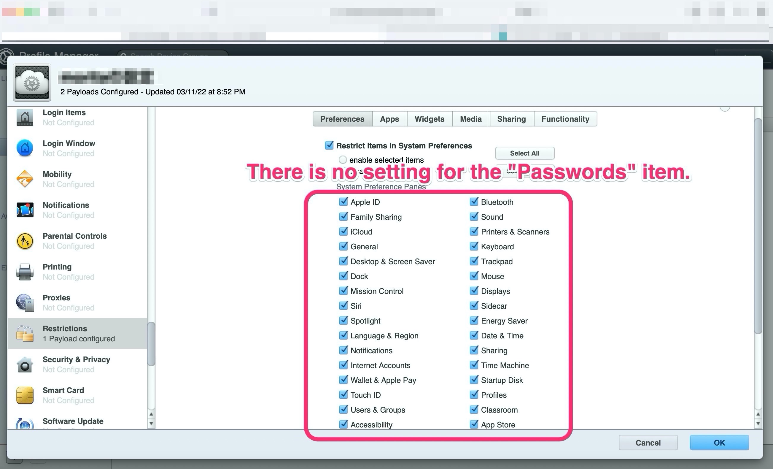 How do I disable "Passwords" in macOS Monterey's System Preferences? I don't see "Passwords" in the Restricted Payload preferences in the Profile Manager.
