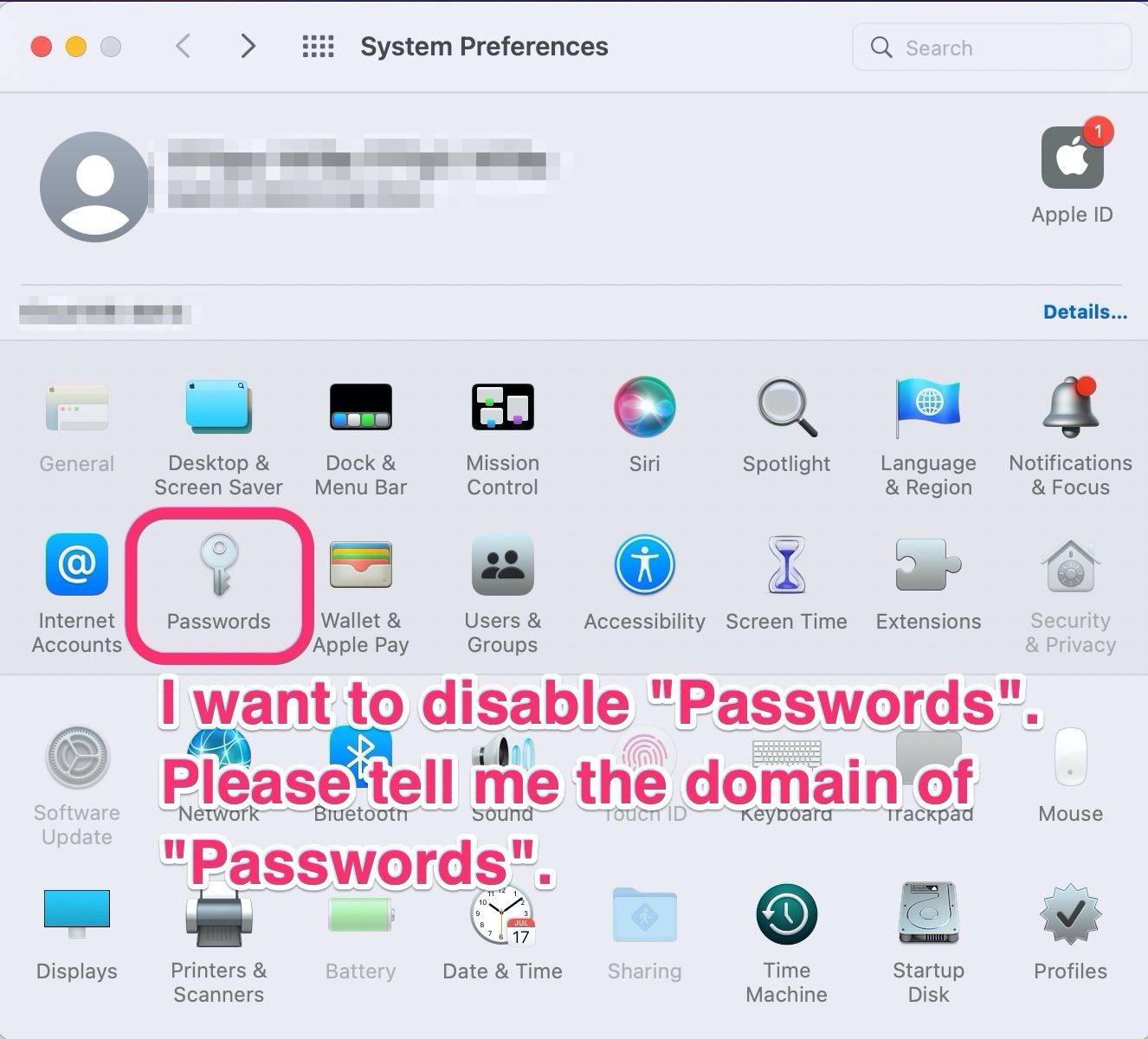 I need to press the "Passwords" domain. For example: "Battery" -> "com.apple.preferences.battery"