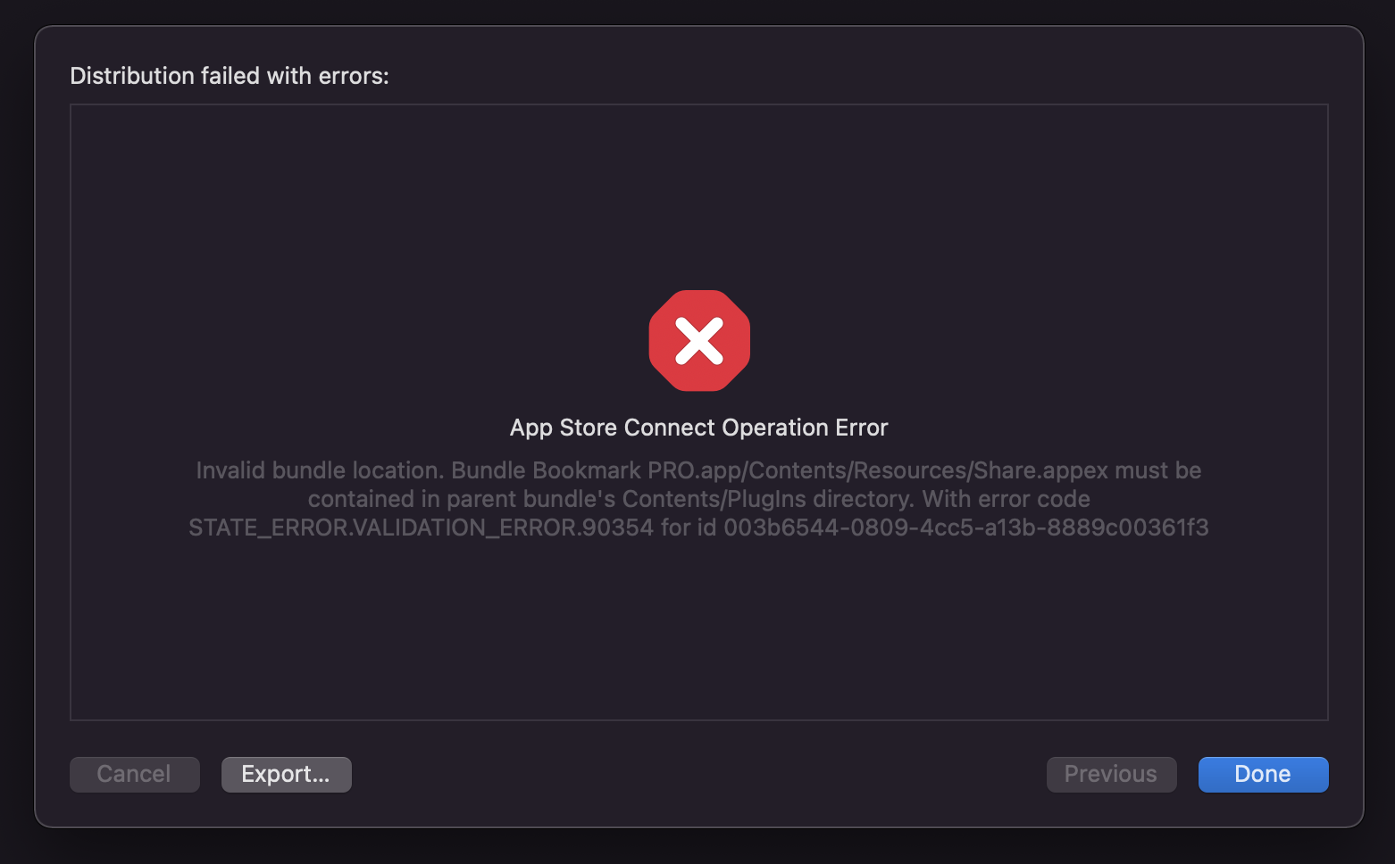 Invalid bundle location. Bundle Bookmark PRO.app/Contents/Resources/Share.appex must be contained in parent bundle's Contents/PlugIns directory. With error code STATE_ERROR.VALIDATION_ERROR.90354 for id 003b6544-0809-4cc5-a13b-8889c00361f3