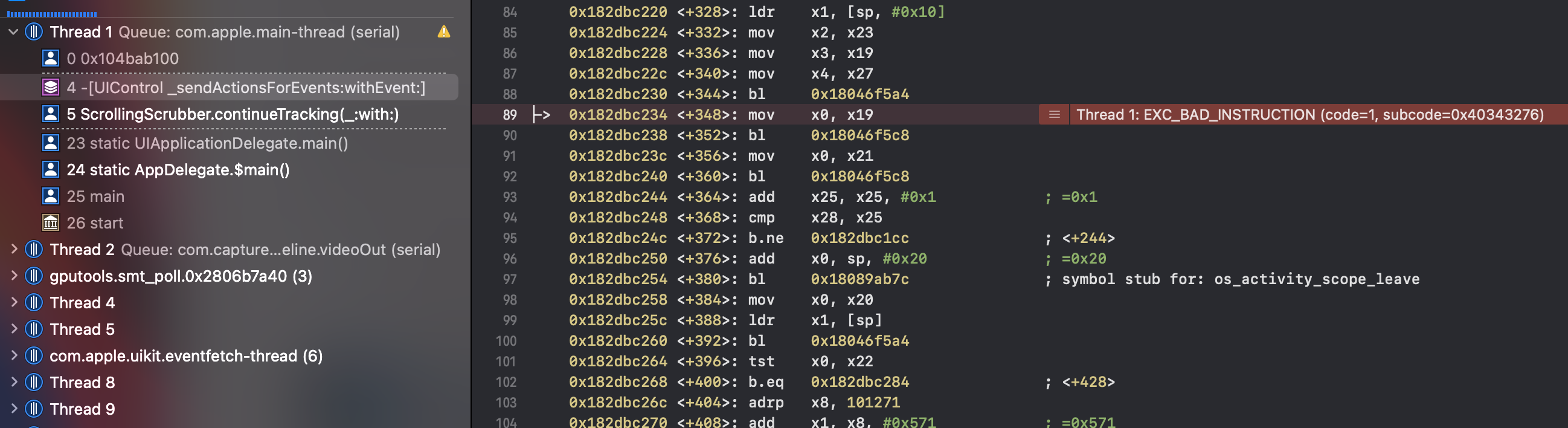 I have a strange crash on iOS device (EXC_BAD_INSTRUCTION). I have a custom UIControl called ScrollingScrubber and all it has is a UIScrollView, and it fires .valueChanged events when user is scrolling. That's where sometimes the crash happens and I have no idea how to debug it further.
