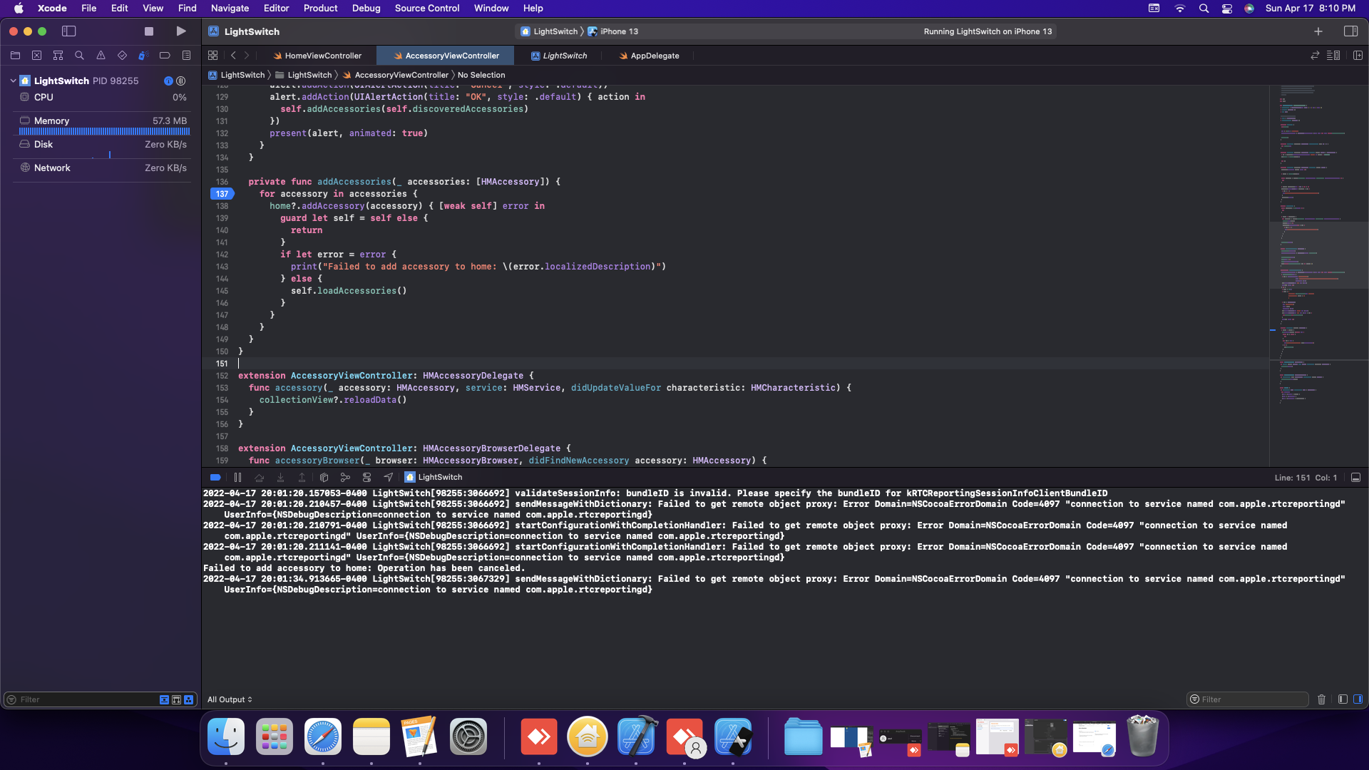 2022-04-17 20:01:20.210457-0400 LightSwitch[98255:3066692] sendMessageWithDictionary: Failed to get remote object proxy: Error Domain=NSCocoaErrorDomain Code=4097 "connection to service named com.apple.rtcreportingd" UserInfo={NSDebugDescription=connection to service named com.apple.rtcreportingd}