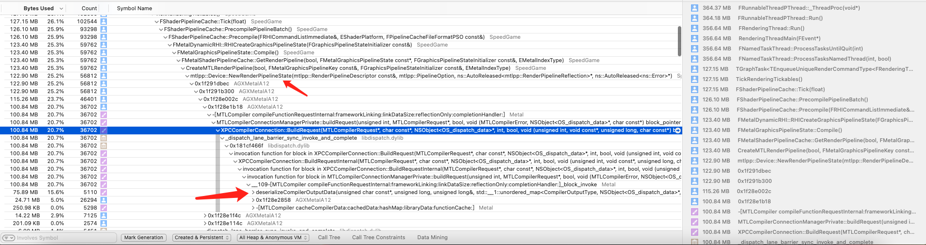 Exactly same issue here. I tried to release both MTLRenderPipelineState and MTLFunction with no luck. How do @Graphics and Games Engineer find out it is related to MTLFunction? The call stack does not show evidence of that. It is linking PSO given MTLFunction which is prepared in another path in Unreal Engine.