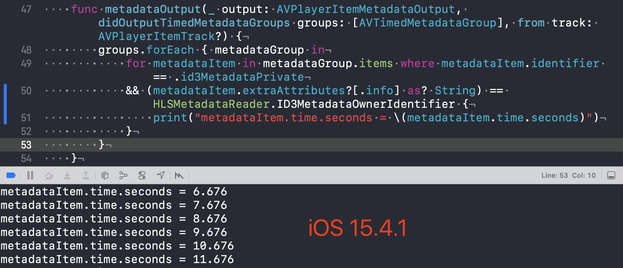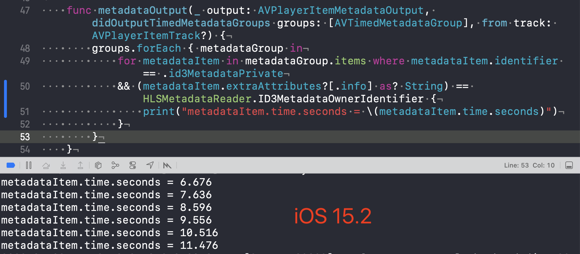I use AVPlayerItemMetadataOutput for live HLS audio stream, each segment is a 0.96 second long AAC containing id3 metadata.