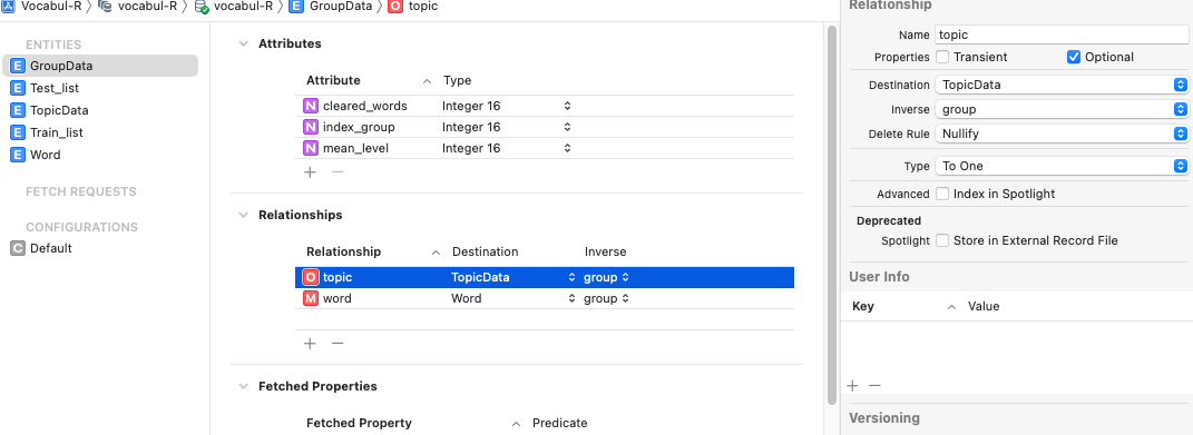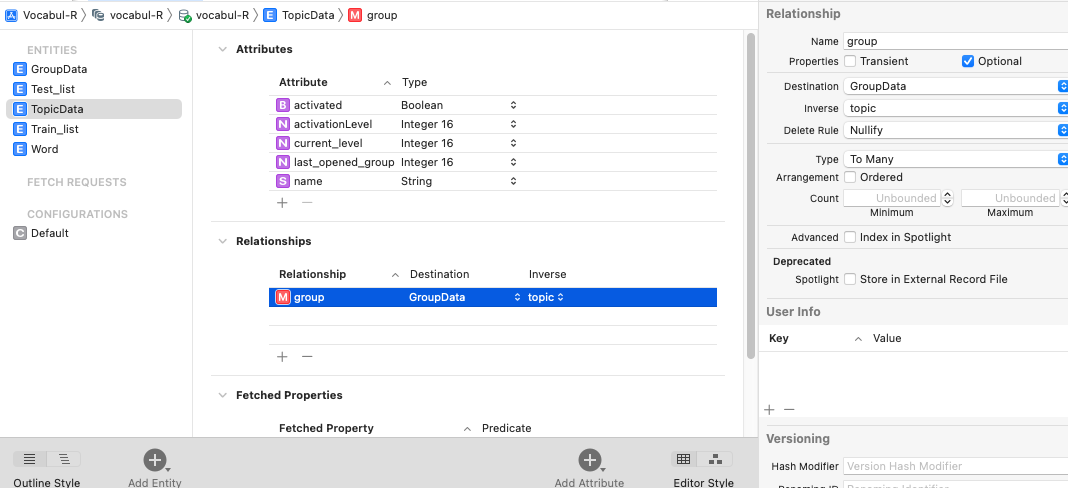 I thought this could be happening because every time I use a topic to update it and save it on context again, a new topic is created which may not be related to GroupData. But I added a constraint in TopicData for name and I still get the same error. Another thing I thought is that relations could be disappearing, since I saw some people had this problem and the issue was that. But I added the retainsRegisteredObjects line in DataController and it didn't work. The full error I get is: Terminating app due to uncaught exception 'NSInvalidArgumentException', reason: '-[TopicData group]: unrecognized selector sent to instance 0x600003812bc0' terminating with uncaught exception of type NSException