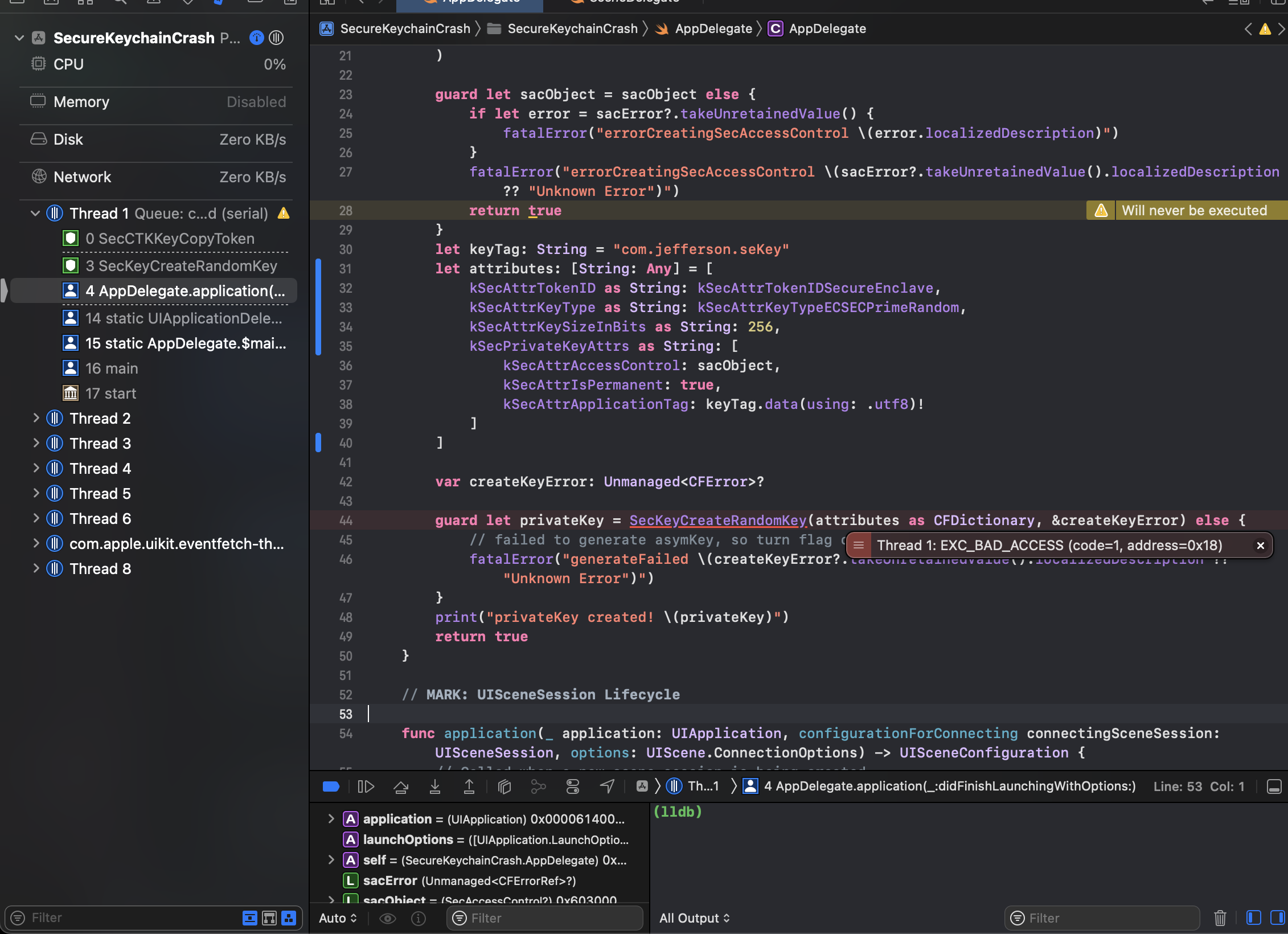 I've used that to generate a private key that will stored in Secure Enclave. I think the crash happen on this attribute (needed to store the key to the Secure Enclave).