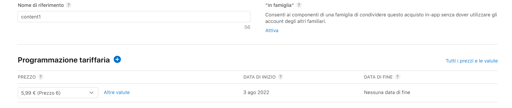 As you can see in app store connect we have created a new product "Content1" with price 6 that in Italy is 5.99€.