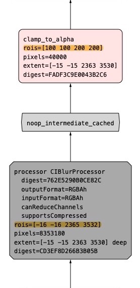 As you can see, the blur filter suddenly wants to process the whole image, regardless of the cropping that happens afterward. The inserted cached intermediate always requires the whole input image as its ROI.