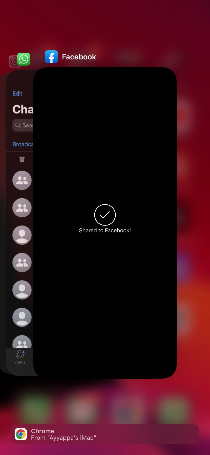 Second when I press the next button in the Facebook sharing view -> another Facebook view gets appear with two buttons (Cancel and Share).... When I click the share button content get share on Facebook and black screen appears with a check in circle and text "Shared to Facebook!" .. And the application get stuck on this Screen.