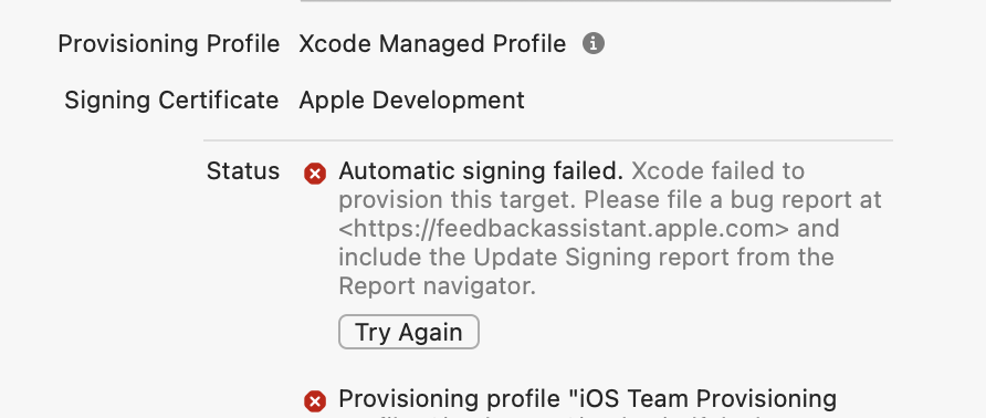 Automatic signing failed. Xcode failed to provision this target. Please file a bug report at <https://feedbackassistant.apple.com> and include the Update Signing report from the Report navigator.