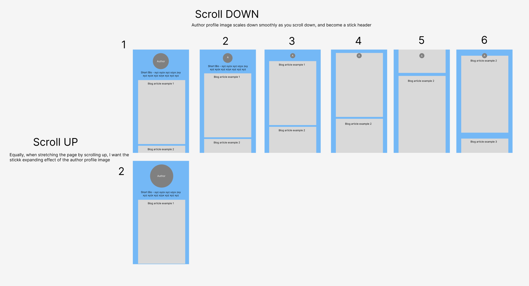 The above image is probably the best way for me to describe what I am trying to achieve. I would like the author's profile image to shrink as the user scrolls down, and then become the pinned header. Using geometry reader I was able to get the image to become larger while continuing to scroll up, but can't get it to scale down. Image will need a minimum size beyond which it won't scale down further even as the user continues to scroll down.