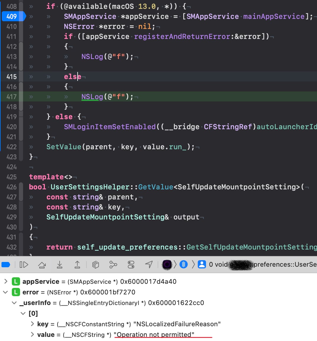 Adding my app to login items stopped working recently (using currently SMLoginItemSetEnabled method). While debugging I noticed that it returns an error "Could not enable login item: com.app.autoLauncher: 1: Operation not permitted". Tried the newest API SMAppService and it's the same like on the screenshot below. What does it mean? How can I fix it? I'm on Ventura but one of my colleagues is on Big Sur.
