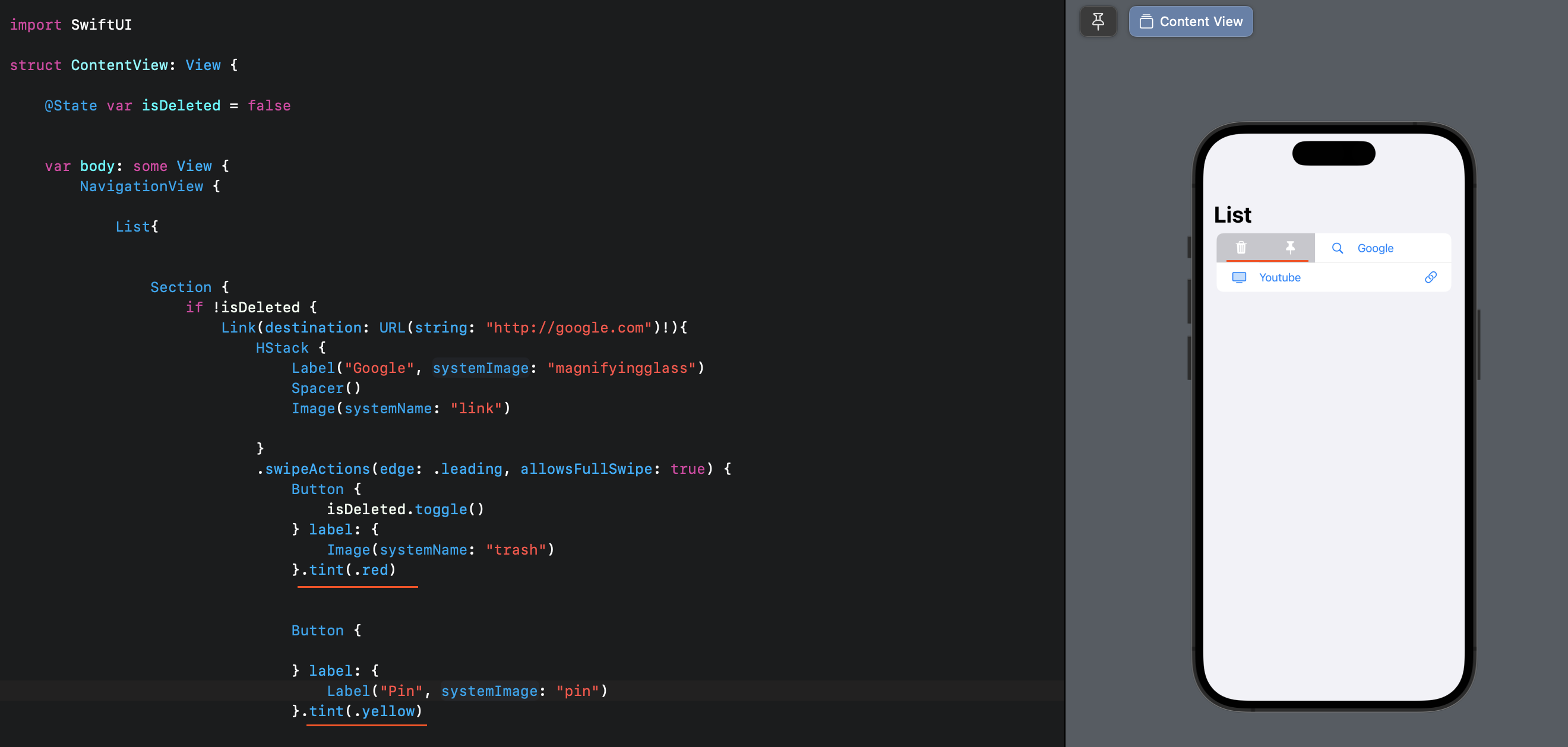 Why Button {...}.tint(.color) doesn't color swipe buttons?