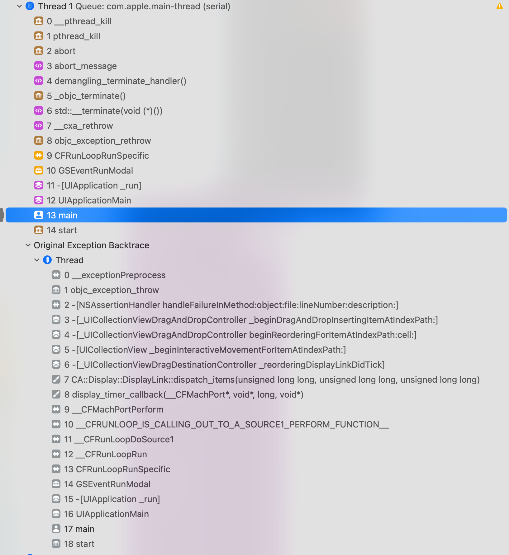 OS Version: macOS 13.0 (22A380) Release Type: User Report Version: 104Exception Type: EXC_CRASH (SIGABRT) Exception Codes: 0x0000000000000000, 0x0000000000000000 Triggered by Thread: 0Last Exception Backtrace: 0 CoreFoundation 0x10fa668bb __exceptionPreprocess + 226 1 libobjc.A.dylib 0x10d49fba3 objc_exception_throw + 48 2 Foundation 0x11164137c _userInfoForFileAndLine + 0 3 UIKitCore 0x124f3c65e -[_UICollectionViewDragAndDropController _beginDragAndDropInsertingItemAtIndexPath:] + 639 4 UIKitCore 0x124f3a699 -[_UICollectionViewDragAndDropController beginReorderingForItemAtIndexPath:cell:] + 281 5 UIKitCore 0x124eee108 -[UICollectionView _beginInteractiveMovementForItemAtIndexPath:] + 263 6 UIKitCore 0x124f479c9 -[_UICollectionViewDragDestinationController _reorderingDisplayLinkDidTick] + 1545 7 QuartzCore 0x10f4b200f CA::Display::DisplayLink::dispatch_items(unsigned long long, unsigned long long, unsigned long long) + 923 8 QuartzCore 0x10f5d7aa9 display_timer_callback(__CFMachPort*, void*, long, void*) + 395 9 CoreFoundation 0x10f991c9f __CFMachPortPerform + 151 10 CoreFoundation 0x10f9c6844 CFRUNLOOP_IS_CALLING_OUT_TO_A_SOURCE1_PERFORM_FUNCTION + 41 11 CoreFoundation 0x10f9c5d8b __CFRunLoopDoSource1 + 538 12 CoreFoundation 0x10f9c0588 __CFRunLoopRun + 2740 13 CoreFoundation 0x10f9bf6f7 CFRunLoopRunSpecific + 560 14 GraphicsServices 0x11659228a GSEventRunModal + 139 15 UIKitCore 0x1259b162b -[UIApplication _run] + 994 16 UIKitCore 0x1259b6547 UIApplicationMain + 123 17 IncidentIntelligenceSystem 0x100a568ff main + 63 (AppDelegate.swift:23) 18 dyld_sim 0x10ad082bf start_sim + 10 19 dyld 0x202a52310 start + 2432Kernel Triage: VM - pmap_enter retried due to resource shortage VM - pmap_enter retried due to resource shortage VM - pmap_enter retried due to resource shortage VM - pmap_enter retried due to resource shortage VM - pmap_enter retried due to resource shortage