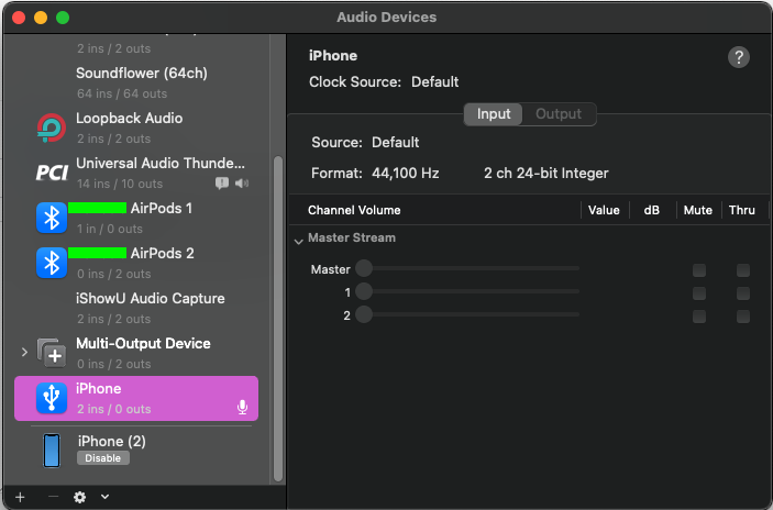 When connected via USB, the iphone will appear in Audio Midi Setup as a device. Currently it is only selectable as an input device. I believe it can be used as an external microphone or a midi input device. My hope is that through code, the grayed output selection could be overridden. Is this even possible?