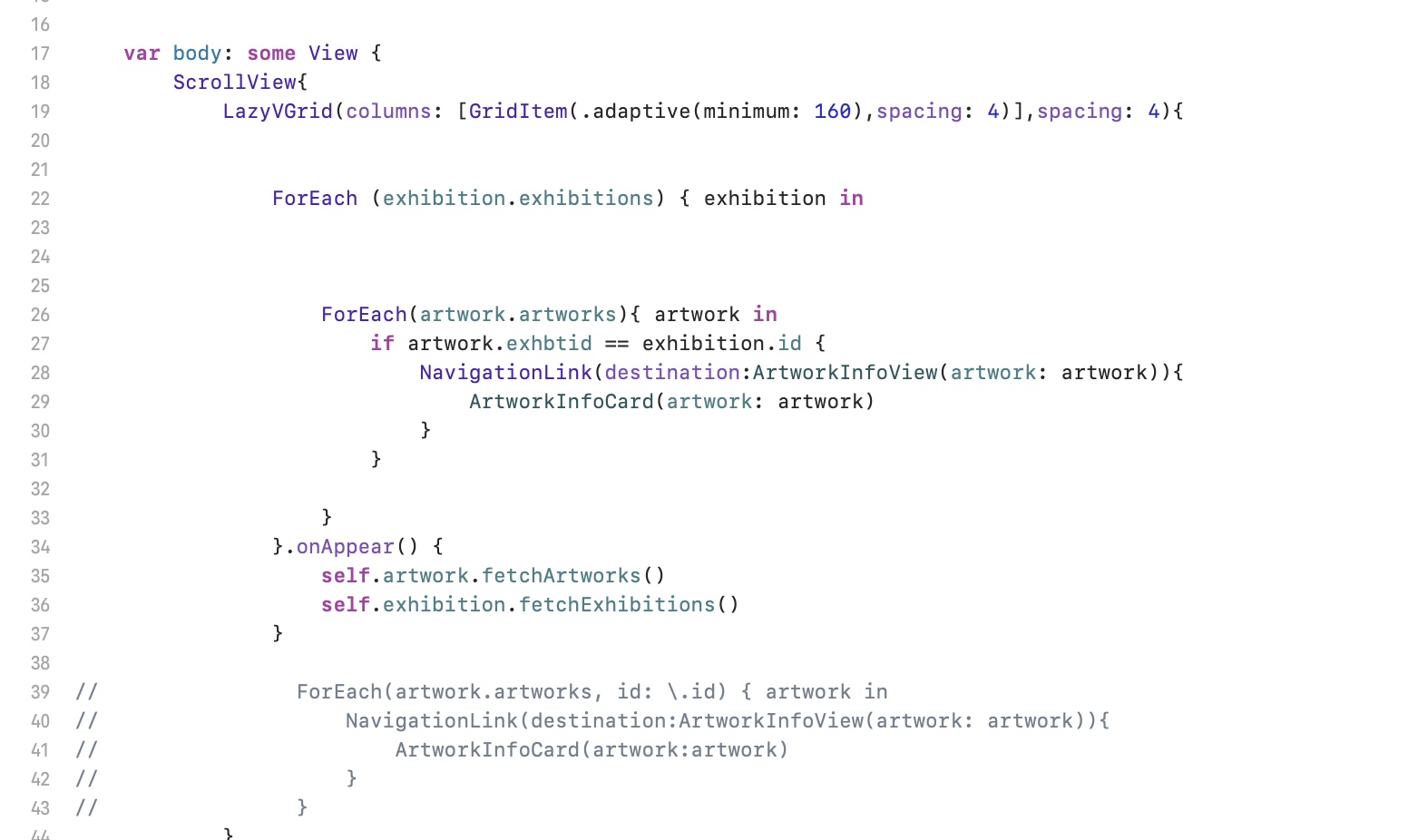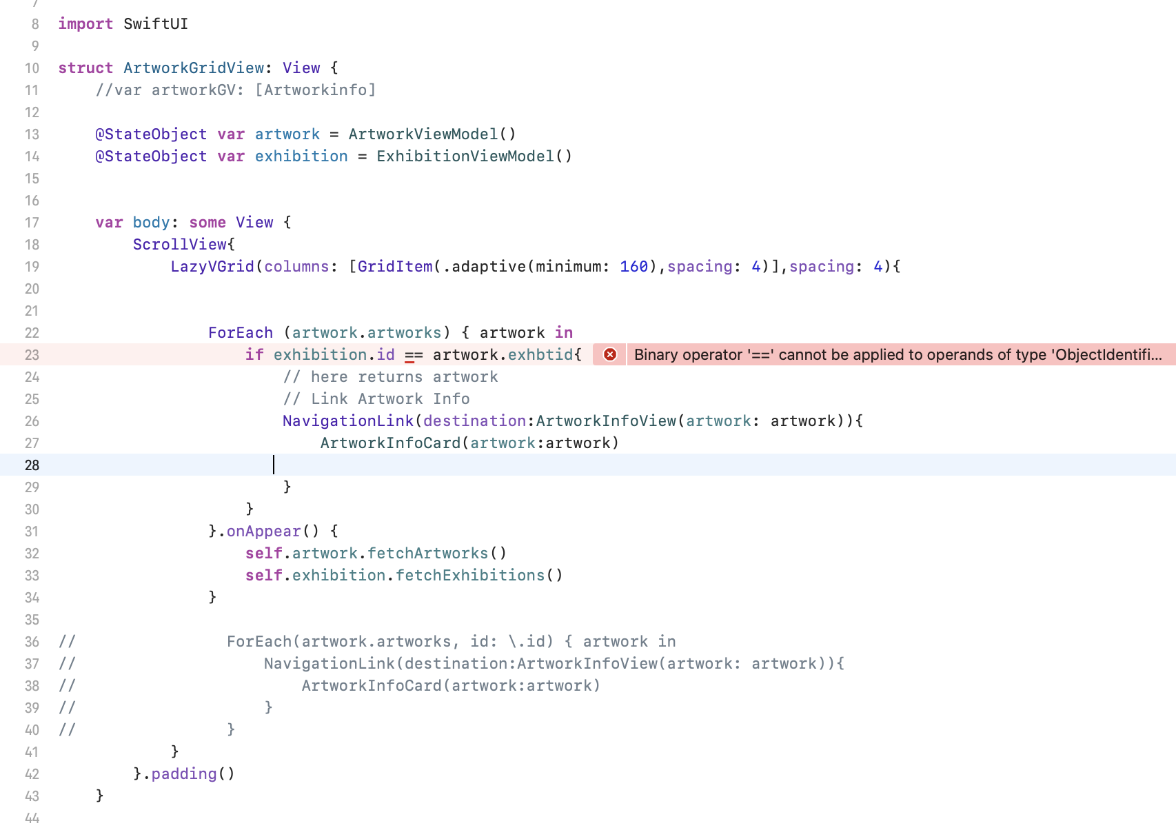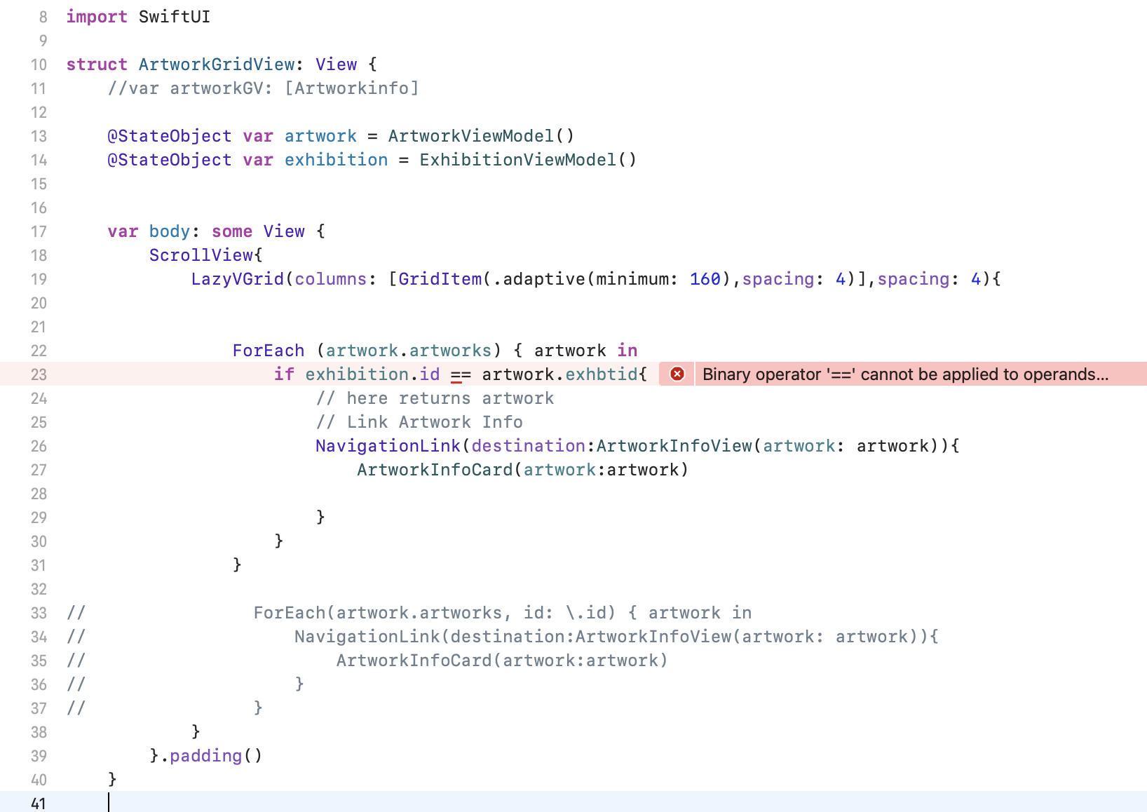 ForEach<Array, String, ForEach<Array, String, Optional<NavigationLink<ArtworkInfoCard, ArtworkInfoView>>>>: the ID 1 occurs multiple times within the collection, this will give undefined results!
