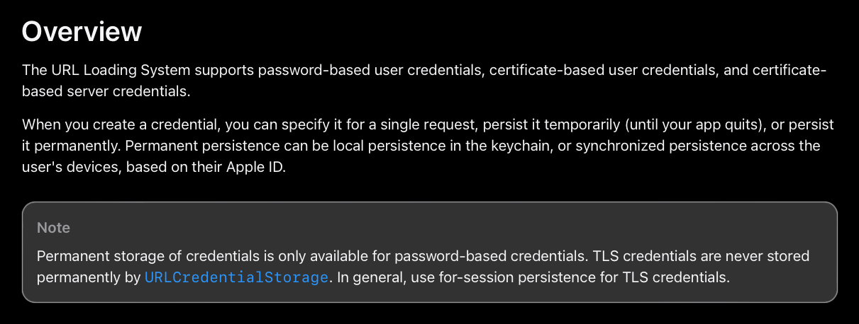 The URLCredential documentation says that “TLS credentials are never stored permanently by URLCredentialStorage. In general, use for-session persistence for TLS credentials”.
