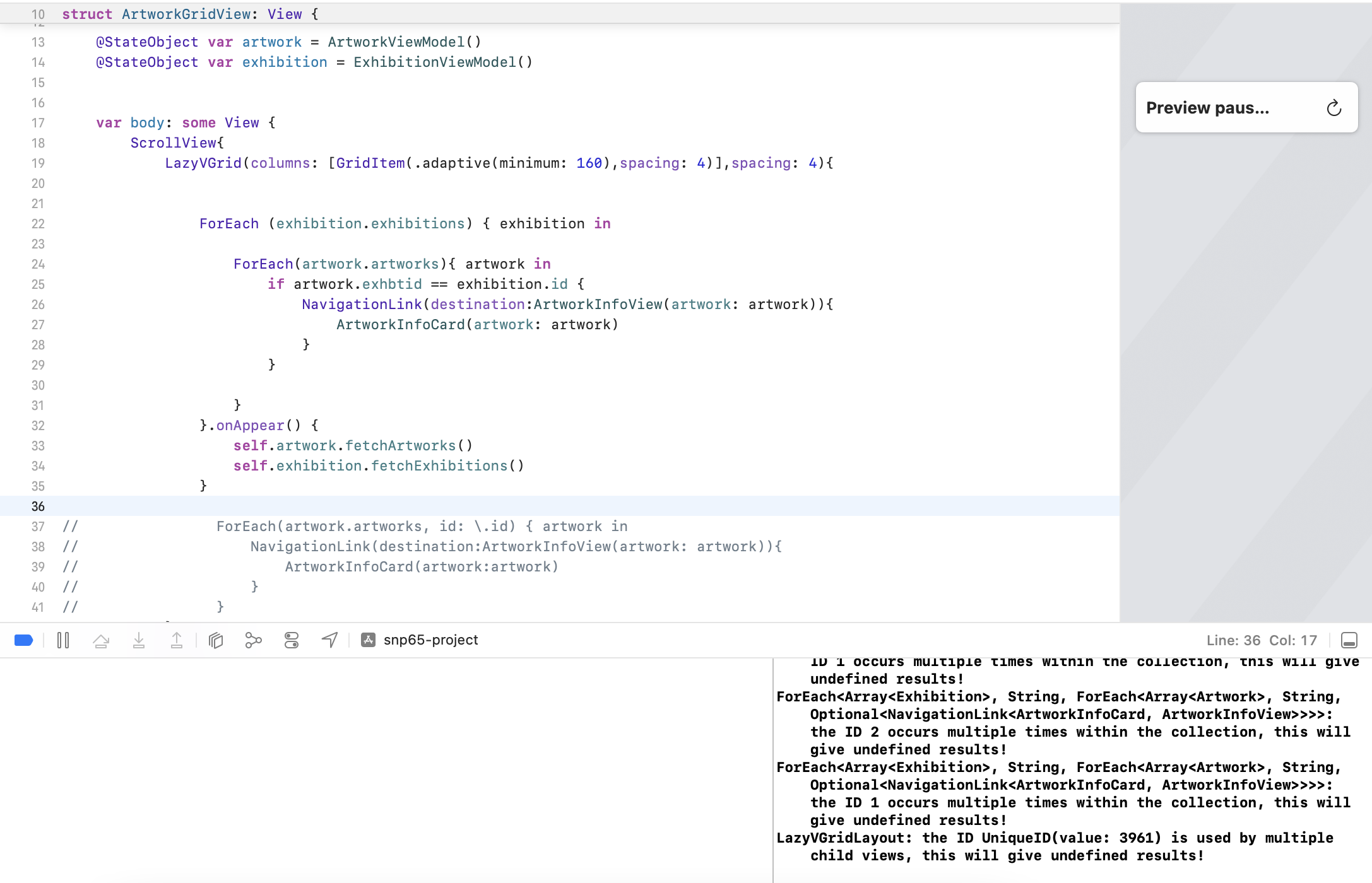 ForEach<Array, String, ForEach<Array, String, Optional<NavigationLink<ArtworkInfoCard, ArtworkInfoView>>>>: the ID 1 occurs multiple times within the collection, this will give undefined results!