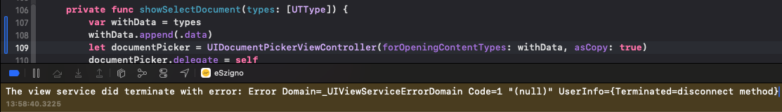 2023-03-19 13:24:34.897379+0100 OpenFile[21887:809433] [AXRuntimeCommon] Unknown client: OpenFile 2023-03-19 13:24:37.962187+0100 OpenFile[21887:809278] [DocumentManager] The view service did terminate with error: Error Domain=_UIViewServiceErrorDomain Code=1 "(null)" UserInfo={Terminated=disconnect method}