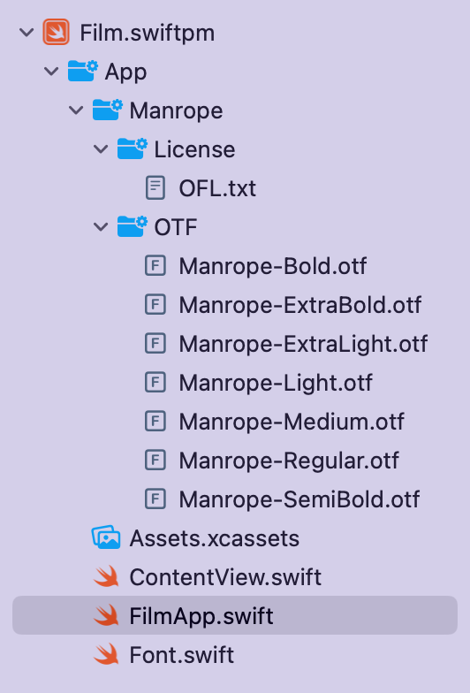 How can I do this? I would really like to have a solution in SwiftUI, and I really wished that the linked solution would work as it seems like a great solution. My only thought now is that I am putting the fonts in the wrong directory, as .swiftpm files do not come with a Resources folder, unlike an older macOS .playground file, for example. I will attach a picture of my file structure here if that is helpful. I definitely know that the official PostScript name of my files match the names of the font variations in the screenshot (I double checked in Mac's FontBook). I have been trying to fix this for long enough to know that I definitely am not spelling anything wrong and I know that the file is definitely not corrupt because I can use it in other softwares and I got it from a reliable source.