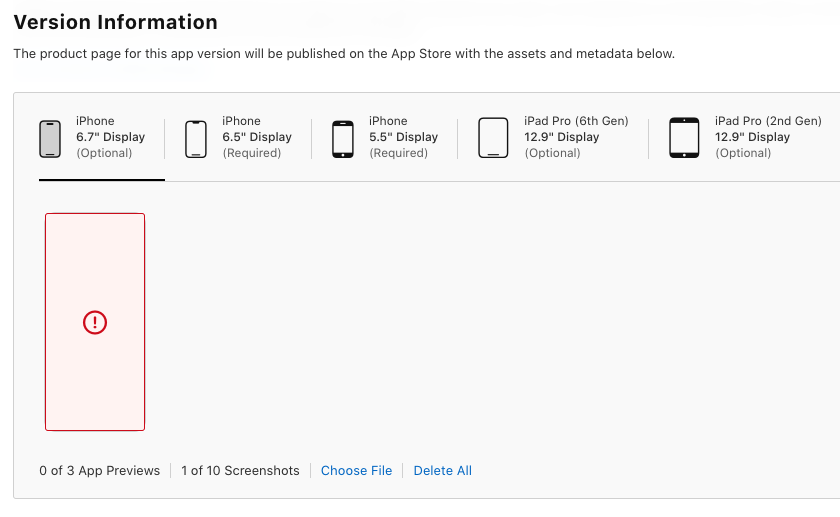 Then, after 1-2 minutes, the image becomes a red box with an exclamation point on it. The images were created in the Xcode simulator for the iPhone 14 Pro Max which matches the iPhone 6.7" Display specs. I've tried many times and it fails in the same way each time. Old images that were accepted previously, are no longer accepted. Any ideas as to what is going wrong?