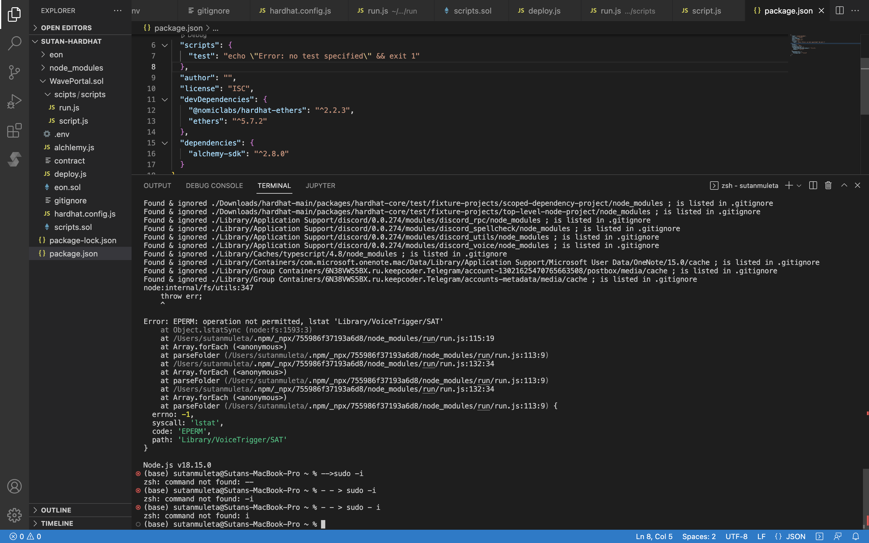 To fix this, change into your Hardhat project directory (e.g. cd /path/to/SUTAN-HARDHAT) and invoke Hardhat directly... either with npm run deploy (if you’ve defined a deploy script in your package.json) or with npx hardhat run scripts/deploy.js --network <network>. That way Node won’t wander into macOS system folders and you’ll avoid the EPERM.
