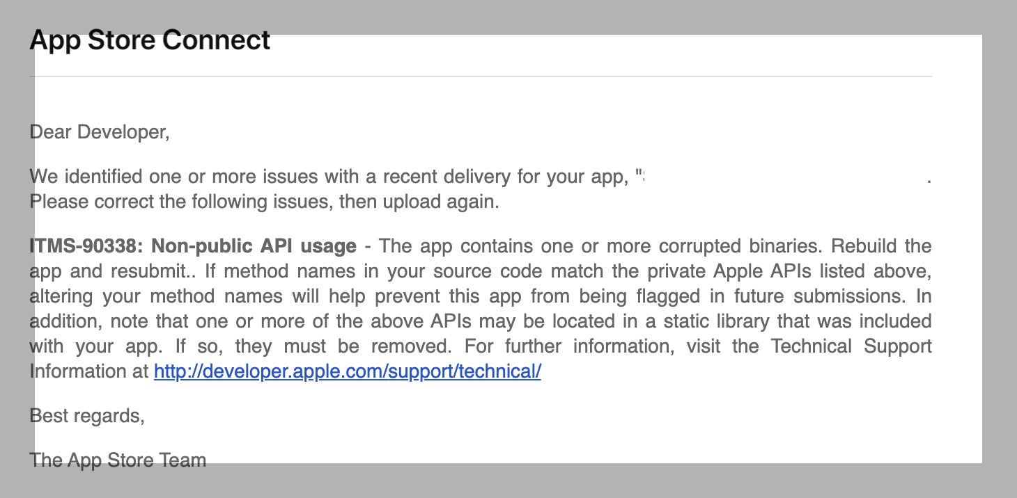 ITMS-90338: Non-public API usage - The app contains one or more corrupted binaries. Rebuild the app and resubmit.. If method names in your source code match the private Apple APIs listed above, altering your method names will help prevent this app from being flagged in future submissions. In addition, note that one or more of the above APIs may be located in a static library that was included with your app. If so, they must be removed. For further information, visit the Technical Support Information at http://developer.apple.com/support/technical/