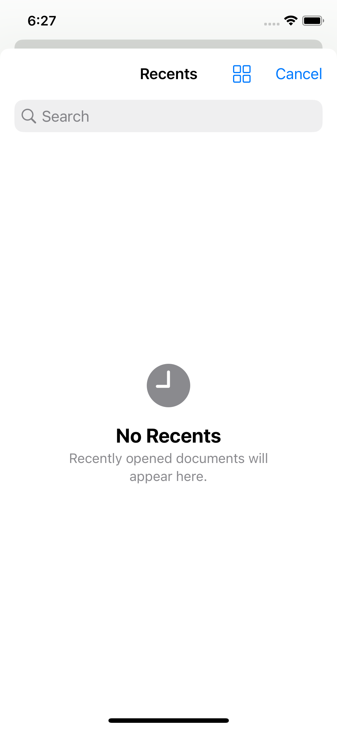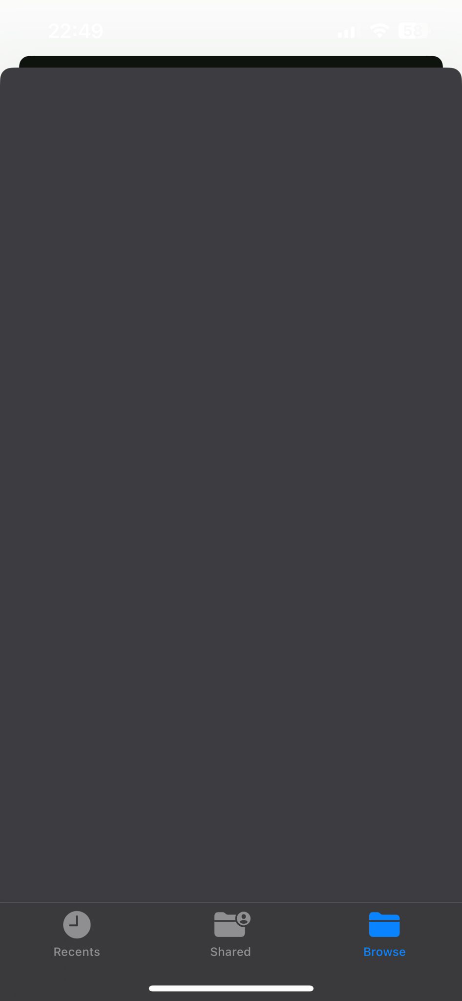 As you can see there is only the Recents option and there is no way to get the Browse button to go to iCloud, Dropbox, My Device, etc... Search bar is working, it finds my files in those locations but it's more friendly to have the browse button.