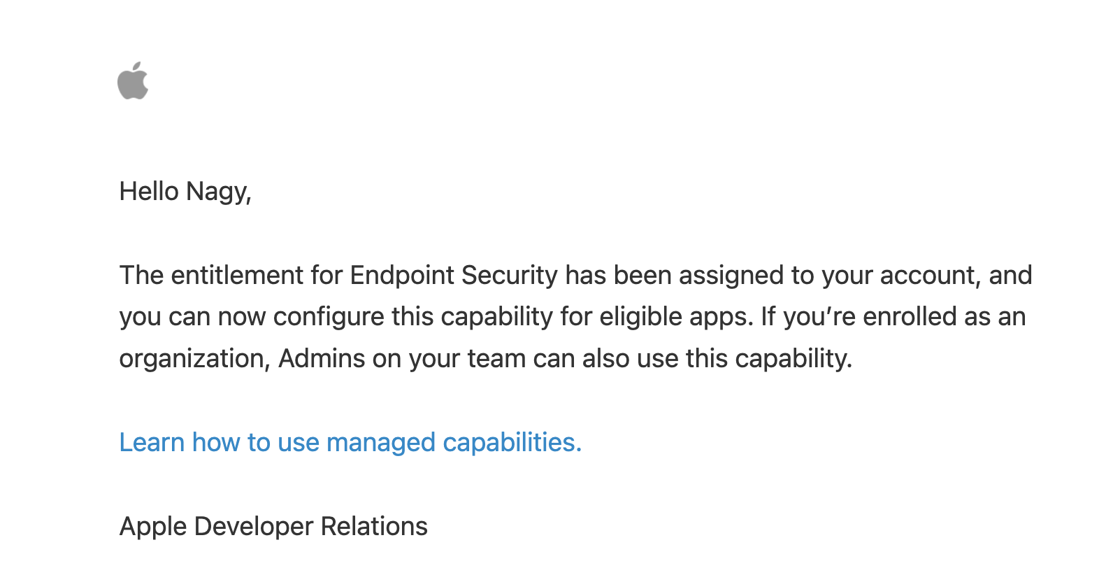 Today, after five months I have received an email from Developer Relations that "The entitlement for Endpoint Security has been assigned to your account". As you can see on the attached images, this supposed to be the Production Entitlement (I got the dev entitlement a while ago).