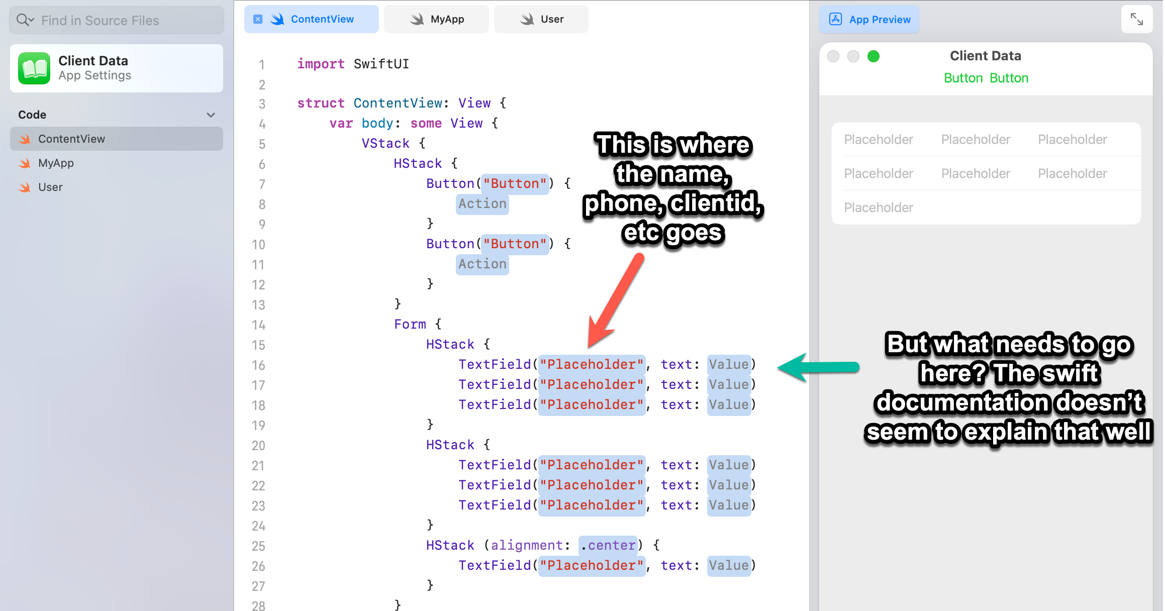 TextField(Name, text: ???) I've tried defining a variable in my User.swift file (I can't import which might be the problem). Even if I could import the User.swift file, I'm not even sure of what would go after the "text:____" spot - I've tried using the $name or changing it to "self.name" and there's always a problem