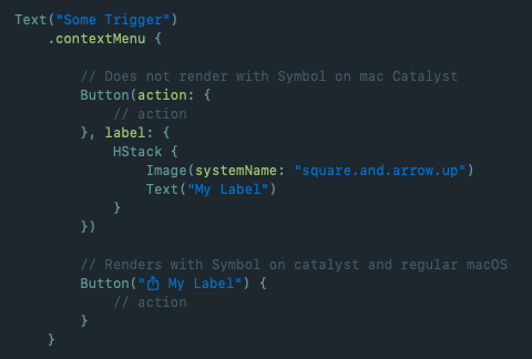 Both buttons render fine on native macOS (e.g Sonoma) but Catalyst refuses to render the symbol at all. I tried every possible combination I could think off. The only way I found was to directly copy and paste a symbol from the SF symbols app and inline it with the label string as unicode. Unfortunately I have a couple custom SF symbols so this isn't really an option for me.