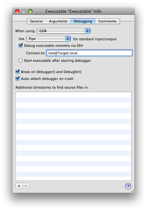 There’s currently no supported way to remotely debug a macOS program using Xcode [1]. This is an oft-requested feature and, while a lot of underlying infrastructure for this has been added in recent versions of Xcode, it’s not packaged as something we can use (r. 58890752)-:
