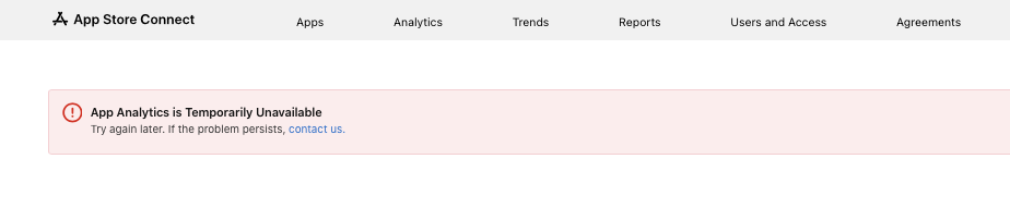 Dear Apple community Since Tuesday the App Store analytics page is down. Does anyone face the same issues or does someone know how to fix this? Please see screenshot: