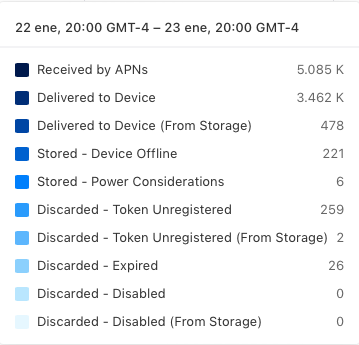 We currently have almost 5.5k users who have mainly installed the app on their iPhones. As you can notice the APNs received a bit more than 5k notifications but what it is remarkable is the fact that only about 70% of the users receive the notification on their devices. Few notifications are on the APNs storage and delivered later on. Some devices can be offline and others are can be on power save mode but I don't understand why so many users are not receiving the notification (this particular notification is sent at 5 pm local time).